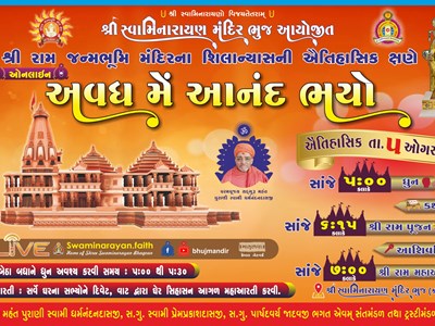 Shree Ram Mandir Janmobhumi Silanyas - Avadh Me Anand Bhayo. To celebrate the foundation stone laying of Ram Janmabhumi Mandir in Ayodhya, Bhuj Mandir Santos have organised a number of activities to commemorate this historic moment. The event will involve the reciting of Katha, Dhun, Pujan, Santo Aashirvaad ending with a unique Maha Aarti.