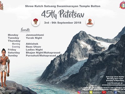 Shree Swaminarayan Temple Bolton will be celebrating their 45th Patotsav celebrations Monday 3rd September to Sunday 9th September 2018. Abhishek will be performed on Thursday 5th September followed by Ankoot Darshan.